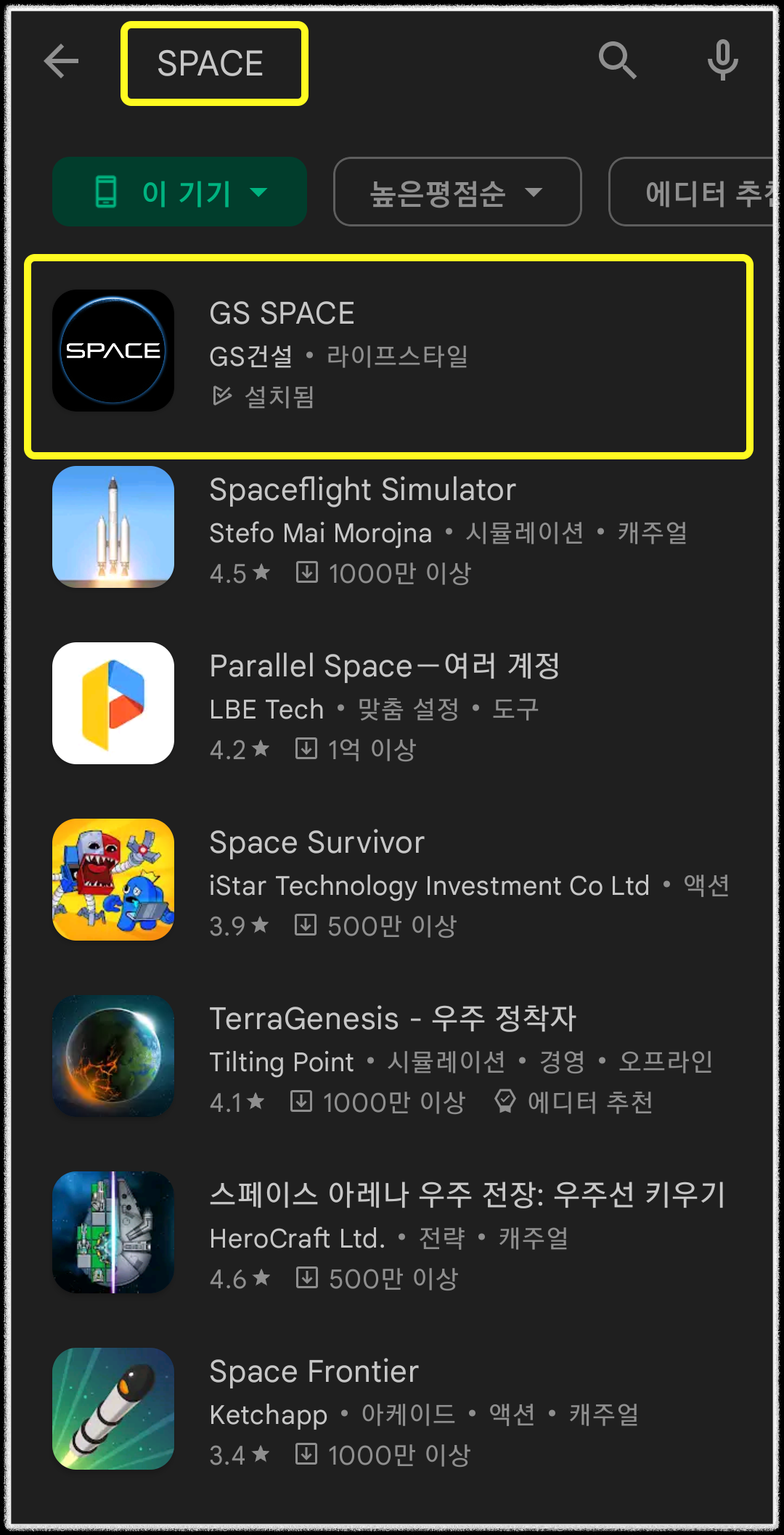 스토어에서 SPACE나 스페이스로 검색합니다