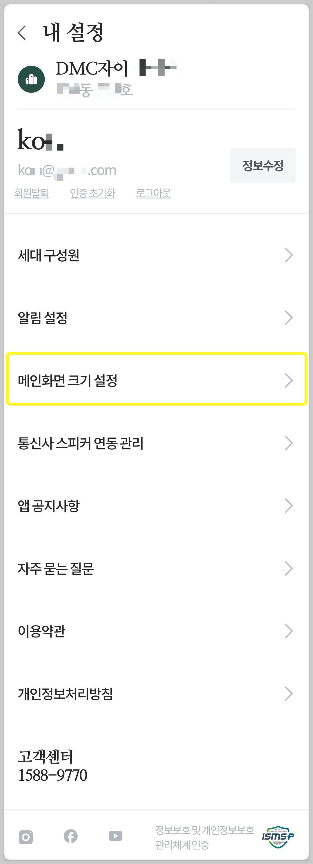내 설정의 메인화면 크기 설정을 선택하면