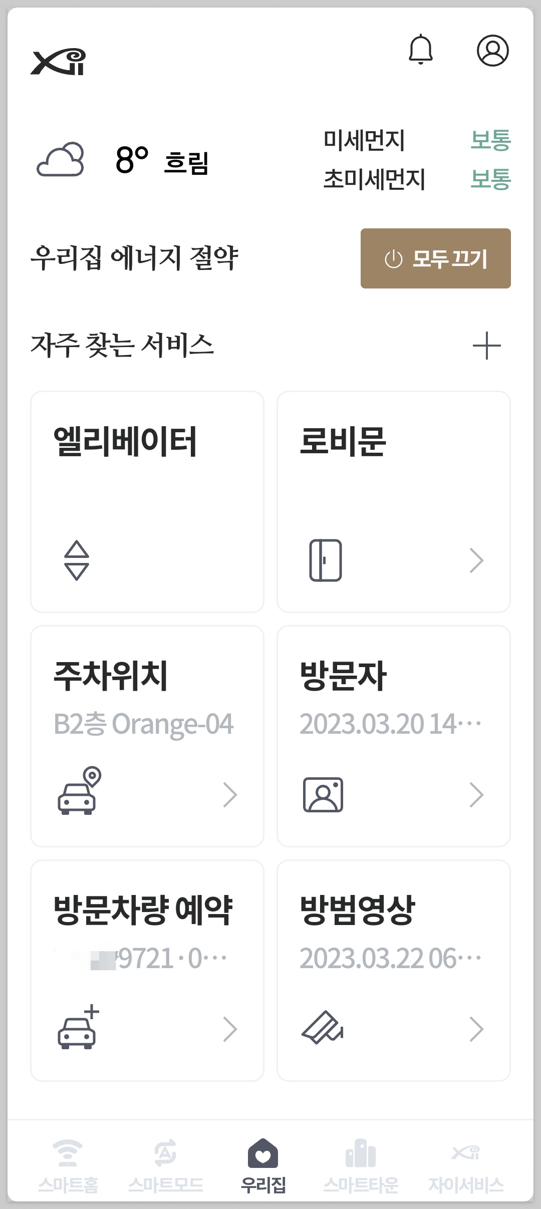 스마트 타운 메뉴는 초기화면인 우리집 탭에