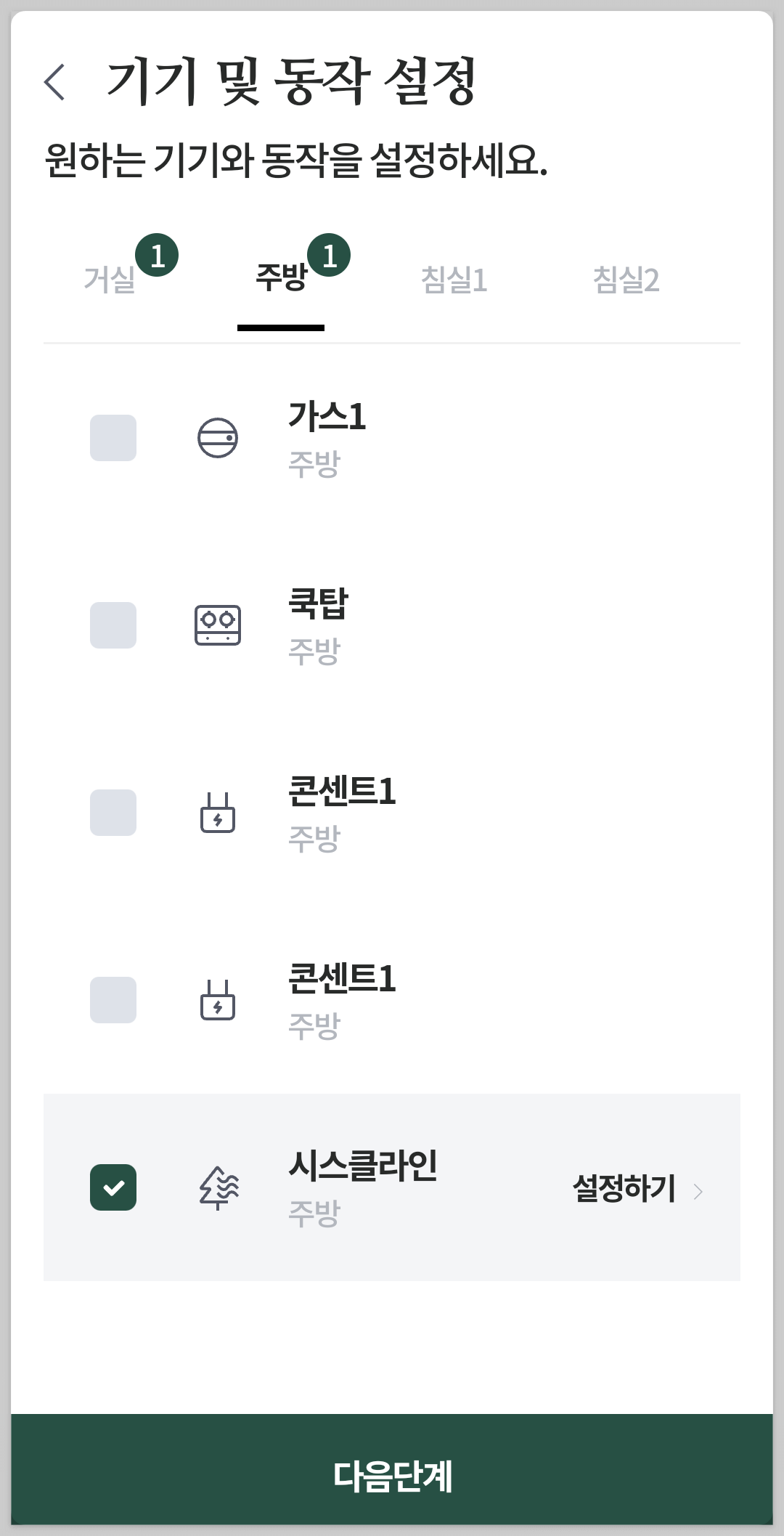 원하는 방과 동작시킬 기기를 선택하는데