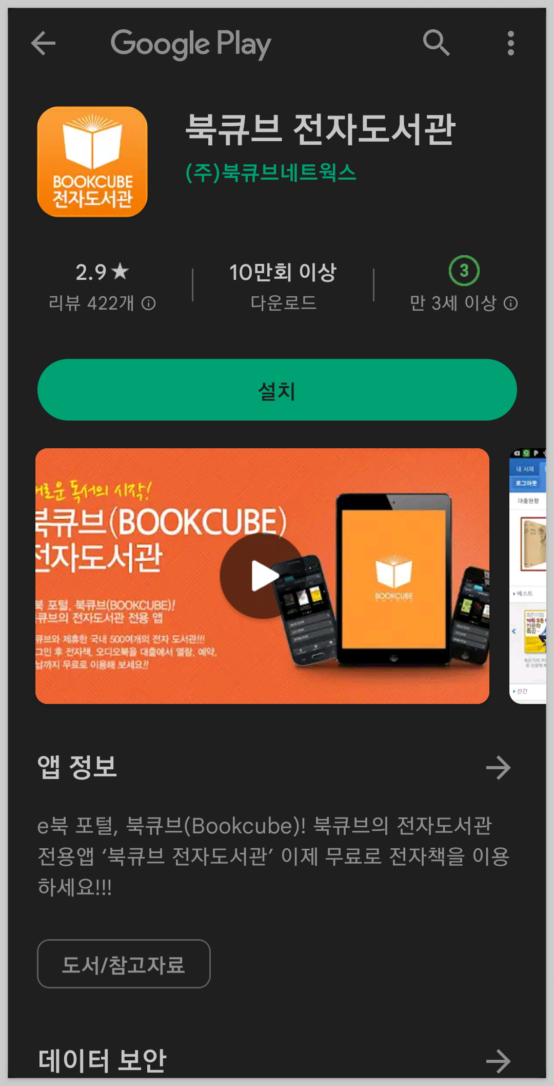 북큐브 전자도서관 앱을 설치해야 합니다